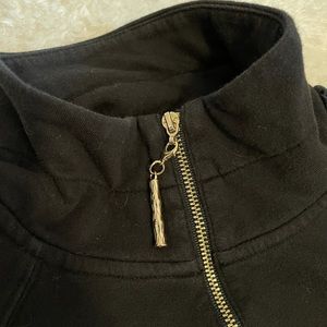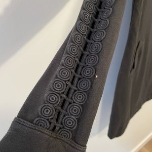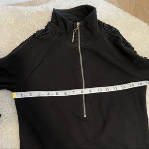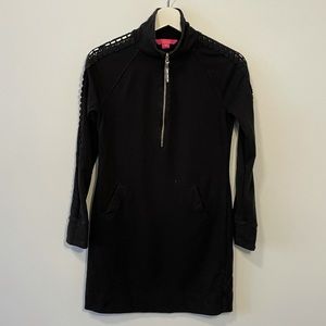 -Solid Straight Skipper Pullover Dress With Half Zip Neck,Novelty Zipper Pull, Functional Pockets, And Lace Trim At Sleeves.