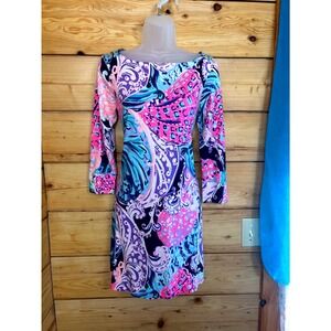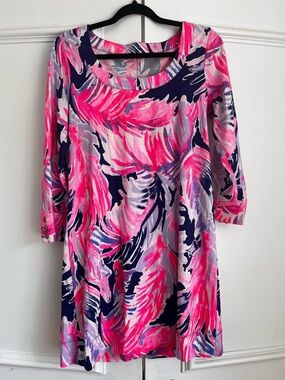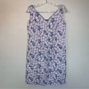This sleeveless mini dress by Lilly Pulitzer features a chic sheath silhouette with a flattering V-neckline. The dress showcases a vibrant floral print in purple and pink, perfect for casual resort wear. It's fitted design and streamlined shape offer a stylish and comfortable fit for sunny days.