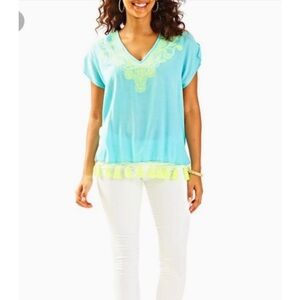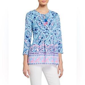 Lilly Pulitzer women's gauzy tunic shirt in blue with a relaxed flowy silhouette, designed with embroidered detailing and lightweight fabric, ideal for casual wear, beach days, or resort-inspired outfits.
