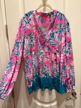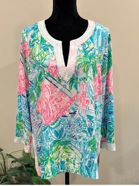 Lilly Pulitzer Womens Embroidered Gauzy Tunic Shirt Size M Long Sleeve Resort