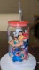 Clear glass tumbler featuring Lilo & Stitch design. Comes with a red lid and straw.