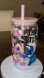Clear glass tumbler featuring Lilo & Stitch design. Comes with a pink lid and straw.