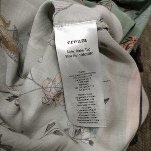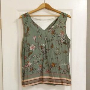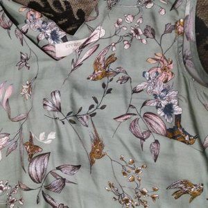 Excellent preowned like new condition, lily-green tank top with back tie up at the neck by Cream. Pale pink, blue, purple, orange floral and bird pattern throughout. Grey, black and beige stripes along the bottom hem. Gorgeous illustration style applied to the overall textile design. Well made and robust. The antithesis of fast fashion. Hardly ever worn, like new condition.