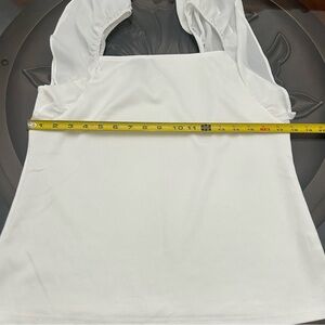 This elegant white top features stylish ruffled sleeves, perfect for any occasion. Its classic design offers a chic and timeless look. Dressy or casual
