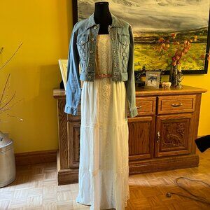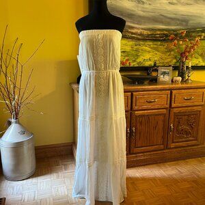 Chic maxi dress featuring crotchet detailing and a bandeau neckline.