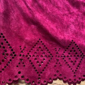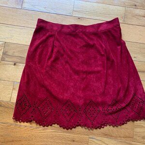 Beautiful deep red faux-suede skirt by Lily Morgan, size Medium. Features a scalloped hem with diamond cutout eyelet details that add a boho-chic touch. Soft faux suede fabric with a slight stretch and a back zip closure. Fully lined for comfort.