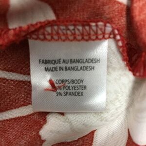 Lily Morgan Blouse. Women's Size Medium. Polyester / Spandex. Rust with off white floral pattern. Short, rolled cuff sleeves. Faux button front. Button close flap chest pockets. Satiny flow to fabric.