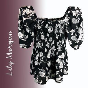 Lily Morgan black and white floral square neckline, puff sleeve, stretchy, travel friendly. Can also be worn off the shoulders. Off the shoulder floral top.