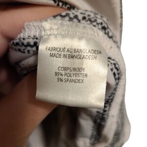 Black stripe print on white short sleeve shirt. V-neck with zipper detail and front pockets. Sleeves have small cuffs. 95% Polyester 5% Spandex