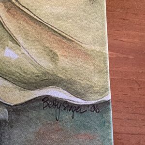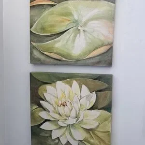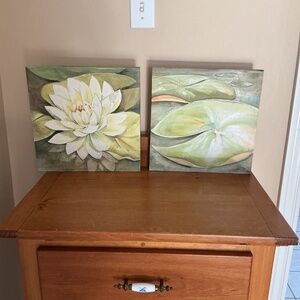 Perfect for bathroom or any room when nature is your theme. Canvas on wooden frames. Hooks on back for easy mounting. Set of two.