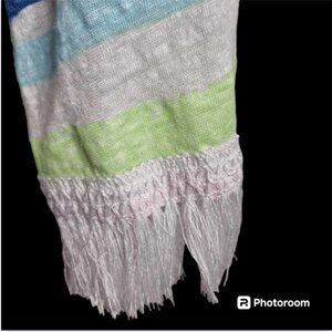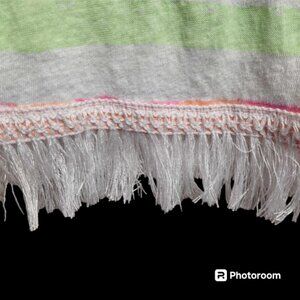Perfect for days at the pool or beach, the colorful multi-stripe pattern, fringe accents, and off the shoulder/scoop neckline give it a fun and flirty vibe.