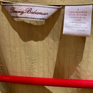 Tommy Bahama silk shirt with a subtle embroidered stripe and pineapple pattern. Mother of pearl buttons, long sleeves with buttoned cuffs.