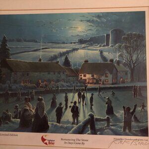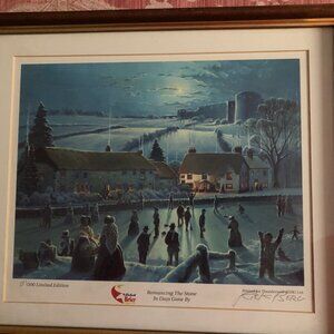 Limited 281/500 edition, printed for Thunderwolf Ltd , Romancing The stone In Days Gone By, Labatt Brier Calgary 97. The print depicts a winter scene in a village, with people ice skating on a frozen pond. The village is set against a backdrop of snow-covered fields and hills, with a large stone building or castle in the distance. The scene is illuminated by moonlight, creating a serene and nostalgic atmosphere. It is signed and professionally framed.