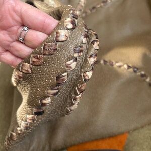 The leather is cervo (deerskin) with tiny lasered holes to approximate the skin of a true peccary. The hand feel is wonderful, the condition is excellent, with one very small dark mark near the strap (see photo 6). Fettuce is in great shape, I've taken multiple photos but please feel free to ask for more. Two interior pockets, magnetic closure. Please note: the fettuce is tie-dyed, and it can be difficult for the viewer to see the accurate condition. I see no issues with it IRL. Colour is most accurate in photo 1.