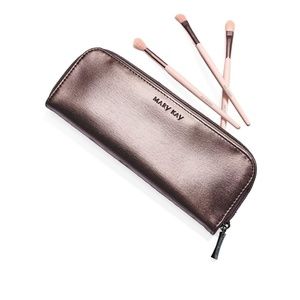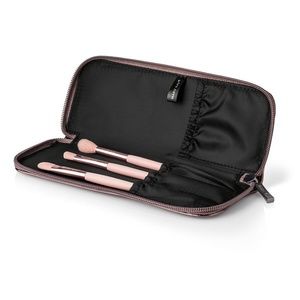 The set includes an eye blender brush, an angled eye crease brush and a wider eye colour brush plus a beautiful rose gold-tone bag.