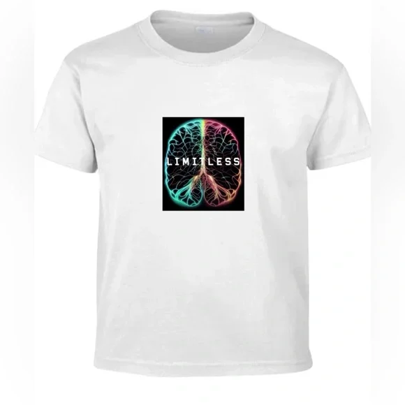 "LIMITLESS" brain graphic tee. Vibrant teal, blue and pink artwork adds playful style. Can’t, won’t, don’t are not in the vocabulary of this tee - be limitless.