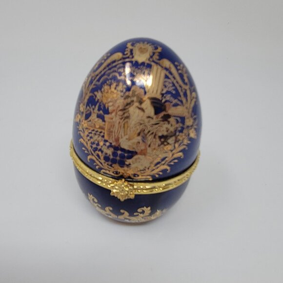 Lovely cobalt blue porcelain easter egg trinket box with gold coloured detailing. Stands approx. 3 1/2 inches tall. Diameter = 2 3/8 inches at widest point. Opens to reveal a clean interior, perfect for concealing a special gift, like a ring, perhaps. In excellent condition, no chips or cracks.