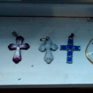 Vintage jewelry, three Limoges (emaille- enamel) crosses; two Rosenthal Bavaria porcelain brooches. All stamped by manufacturer, Limoges are signed by the artist as well. All in excellent condition except the blue jewelled cross which has one small line across the bottom side. I can't feel anything with my finger but it looks like a scratch. Not visible from the front. Can sell separately, price listed is for all 5.