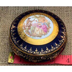 Limoges France Covered Trinket Box Courting Couple Cobalt Blue 4" 22 Karat Gold