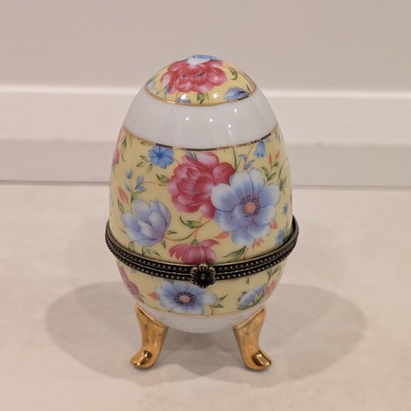 Limoges Hand Painted Egg France Trinket Box with Pink and Blue Flowers