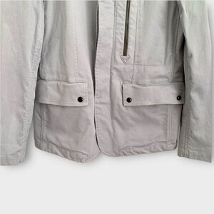 Canvas utility style chore jacket by Lincs DC & Co. Features a collared design, button front closure, and multiple exterior and interior pockets for functionality. The structured yet relaxed fit makes it a versatile layering piece for transitional seasons. Lined interior with contrast piping and a Lincs DC & Co logo patch on the sleeve add subtle detailing.