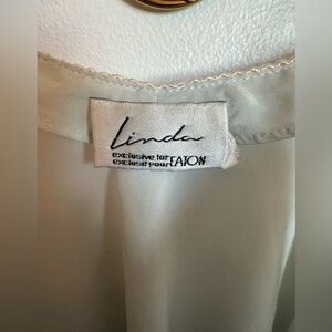 Linda brand exclusively for Easton nightgown/slip dress/negligee. Baby blue delicate soft material. Spaghetti straps are adjustable. White rope like trim on the top hem. No size tag but probably a women’s size XS.