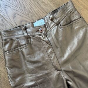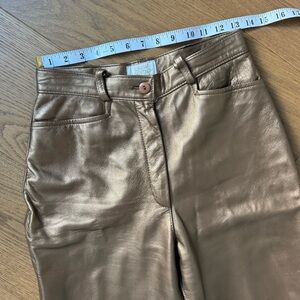 Keywords: metallic leather pants, high waist pants, straight leg, bronze pants, designer pants, statement pants, leather trousers, evening wear, party pants, luxury pants