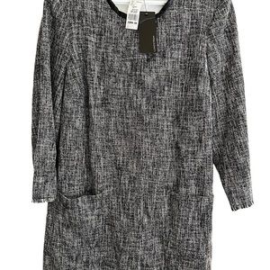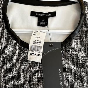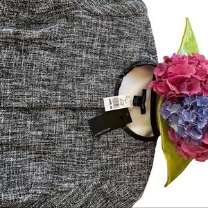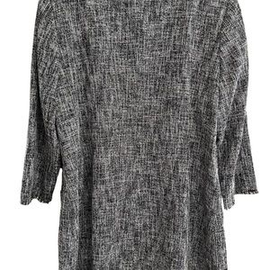New with tags, just a lovely black & white tweed like pattern with black Faux leather trim, feather like fray trim, size 14, see measurements. The front of the jacket buttons up on the inside under coat flap. The length of the coat is 34.5 inches from the top of the shoulder. Open pleat at back hem, see picture.