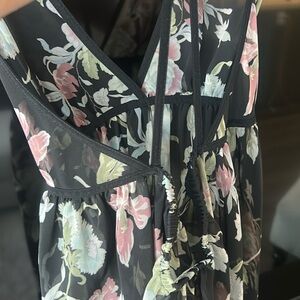 Black sheer fabric with a floral pattern in shades of pink and green.