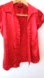 red, short-sleeved button-down shirt, possibly made of satin or a similar shiny fabric. It has a classic collar, a pleated front, and puffed sleeves .