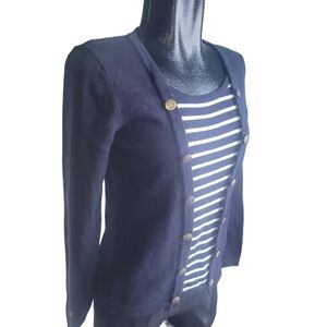 Navy blue nautical vibes sweater with faux blue and white striped front section