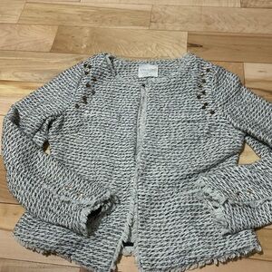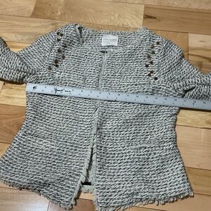 Elevate your style with this chic tweed sweater jacket. Perfect for any occasion, this piece combines comfort and elegance. In good preloved condition with some threading loose and pilling still has loads of adventure left in it. Label says medium but based on measurements it seems more like a small. Off white, black and gold sparkle, spikes and fringe with a classic Chanel tweed look.