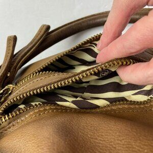Linea Pelle Collection Dylan Medium Leather Tote Bag in Tan Brown. Top zipper closure. Two outside zippered pockets. Can be worn by top handles or shoulder strap. Inner pocket. Good pre-loved condition but note there is some wear (mostly on the lining) - see photos for details. Retails for $425 USD (approximately $591 CAD).