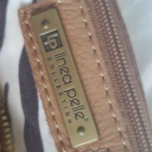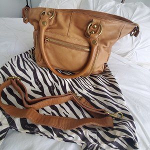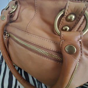 Genuine Italian leather shoulder bag from LA brand Linea Pelle. Very spacious! Used a handful of times and in very good condition - one small stain and scratch on the back of the bag (see photos). Zip top closure. One exterior zipped pocket and three interior pockets. Zebra print interior. Comes with a longer strap to wear crossbody. Matching dust bag is included.