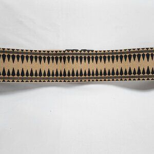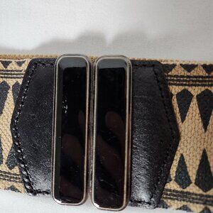 Statement belt by Linea Pelle designs. Main part is almost like painted burlap. Leather and then shiny enamel by the clasp.