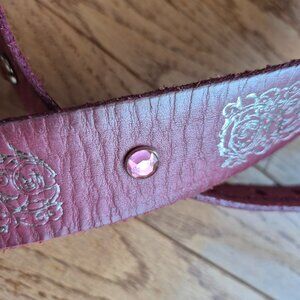 Stylish and high-quality Linea Pelle leather belt in a unique dusty rose/pink shade with embossed floral scroll designs in silver. Made from genuine leather with a wide strap and a sturdy silver-tone buckle. Perfect statement piece to elevate jeans, dresses, or layered looks.