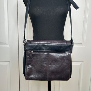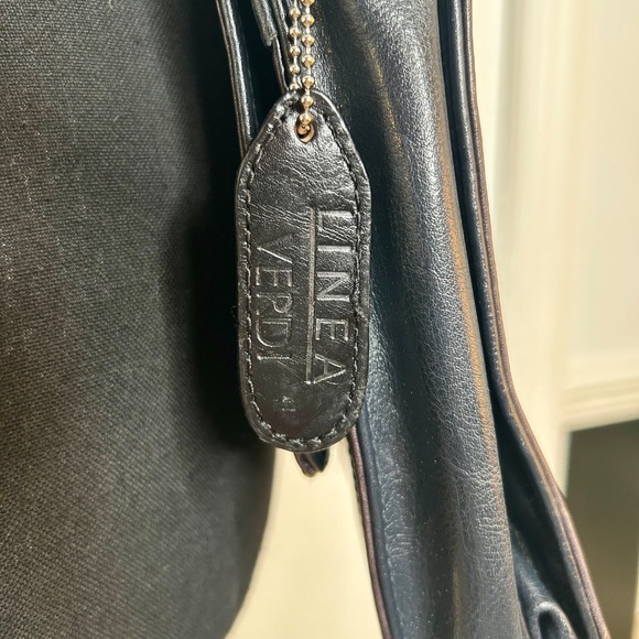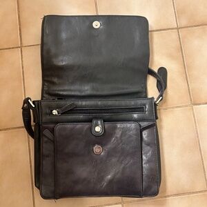 This Linea Verdi genuine black leather purse is functional, simple and classic. The top flap has a magnetic closure. There is pocket under the flap to store essentials that will be readily available. This pocket has a snap closure. The fully lined interior is divided into two halves, with a zipper enclosed space in the centre of the purse. This centre pocket is ideal for items you want fully secured. There is a second smaller zipper enclosed pocket inside the purse along the backside. The front and the back of the purse have thin, zipper enclosed pockets as well. The dimensions are: Length- 10” Width- 4” Height- 9”. The leather strap is adjustable and has a length of 17-21”. This purse can be worn across the body or on the shoulder. This purse is in excellent condition.