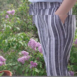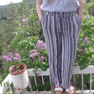 Linen blend women's summer pants by Briggs ,size small ,in very good condition .Striped Dark gray and white .with a draw string and pockets.