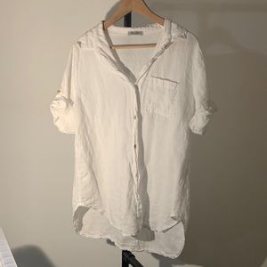 Bright white, 100% Linen, button-down tee with rolled sleeves, pretty iridescent buttons and breast pocket. Never worn, needs ironing. Like new condition, no stains or underarm discolouration. Made in Italy. Would make a great swim coverup too. Lightweight and very breathable. Non-smoking home.