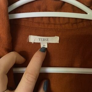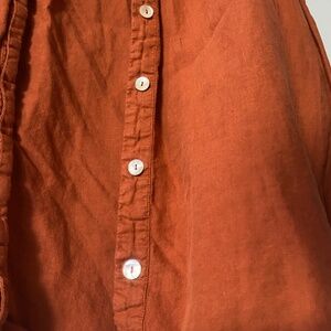 Burnt orange coloured collared button-up. Super cute buttons!! It is a size XL, but I usually wear a size medium and it fits me well as a loose-fit overthrow. The arms are not full length. Can be dressed up or down for a more formal/business or casual look.
