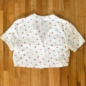 This was purchased a few years ago from H&M/Divided and never worn. Size small short sleeve blouse with a cherry print all over and made of a linen/cotton blend (88% cotton, 12% linen) and comes with a replacement button. The style is very cropped and features a collar, button down style, and bust darts.