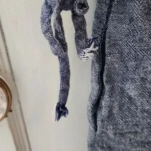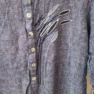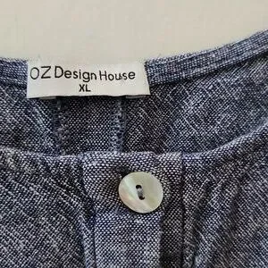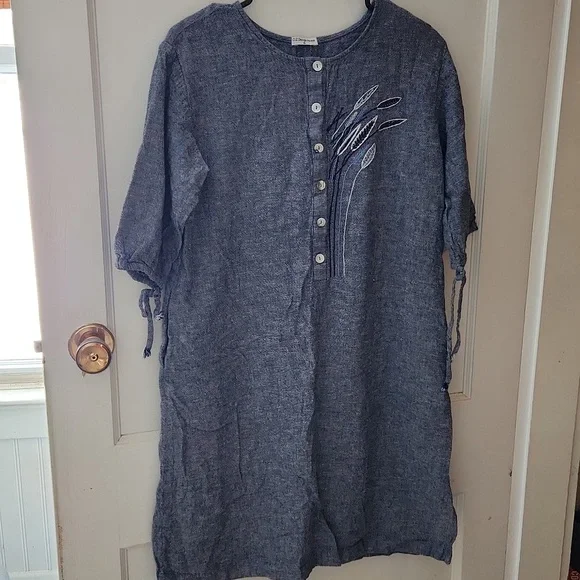 Cute dress by Veitmanese maker I think. It says XL but please note that is an Asian sizing. It measures 18.5 inches pit to pit and about 36 top to hem. No fabric tags but feel like linen. Has 2 side pockets and small slits either side on bottom