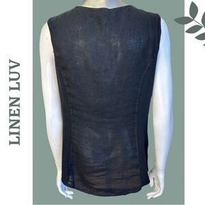 Beautiful linen button front sleeveless top with side knit gusset for extra comfort.