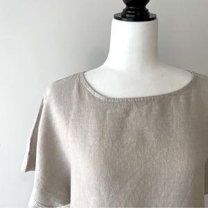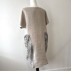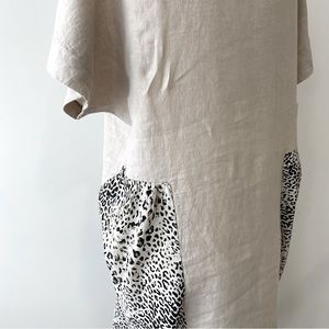 Simple beautiful linen tunic dress with animal print accents on the sides. Super versatile and easy to wear.