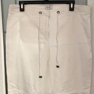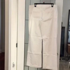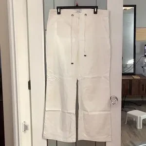 White linen pants. 17” waist laying flat. Inseam 30”. 10.5” width opening at bottom of leg. Elastic waist with a tie. Good used condition.
