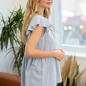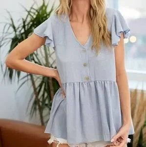 This semi button down top is lightweight and flowy and is made of a linen material. Features a v neckline, ruffle sleeves that adds a romantic feel to it. Model/Picture information Height: 5'8 US Size: 2 Bust: 33" Waist: 25" ** Model wears a size small**