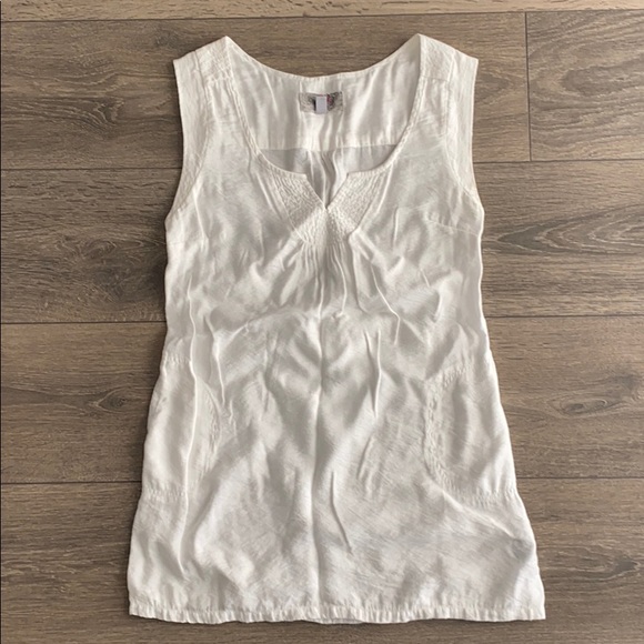 Gently worn white tunic. Linen appearance, acrylic fabric. Pockets on the sides. Slight pilling.