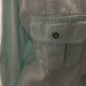 Lovely linen faded aqua blue. Very soft, relaxed fit, 2 front pockets. In good used condition.