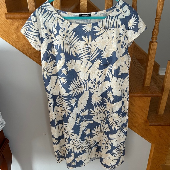 Pretty beige and blue linen dress. Never been worn but tags are off. It is a one size (12-14).