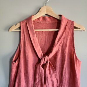 Beautiful linen dress in soft red (coral) color with bow, ruffle details and pockets on the side. Would fit about size Medium-Large. Please see measurements. Good condition.